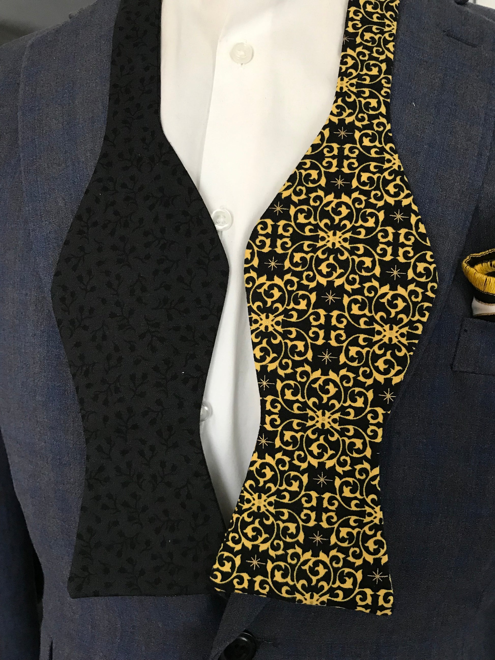 Upgrade your formal look with our Black and Gold Reversible Bowtie Set (FATBOW). Made from high-quality cotton suiting, our paisley print design is reversible for versatility. Elevate any outfit with this stylish and functional accessory. Perfect for any occasion, be it a wedding, business meeting, or a night out.