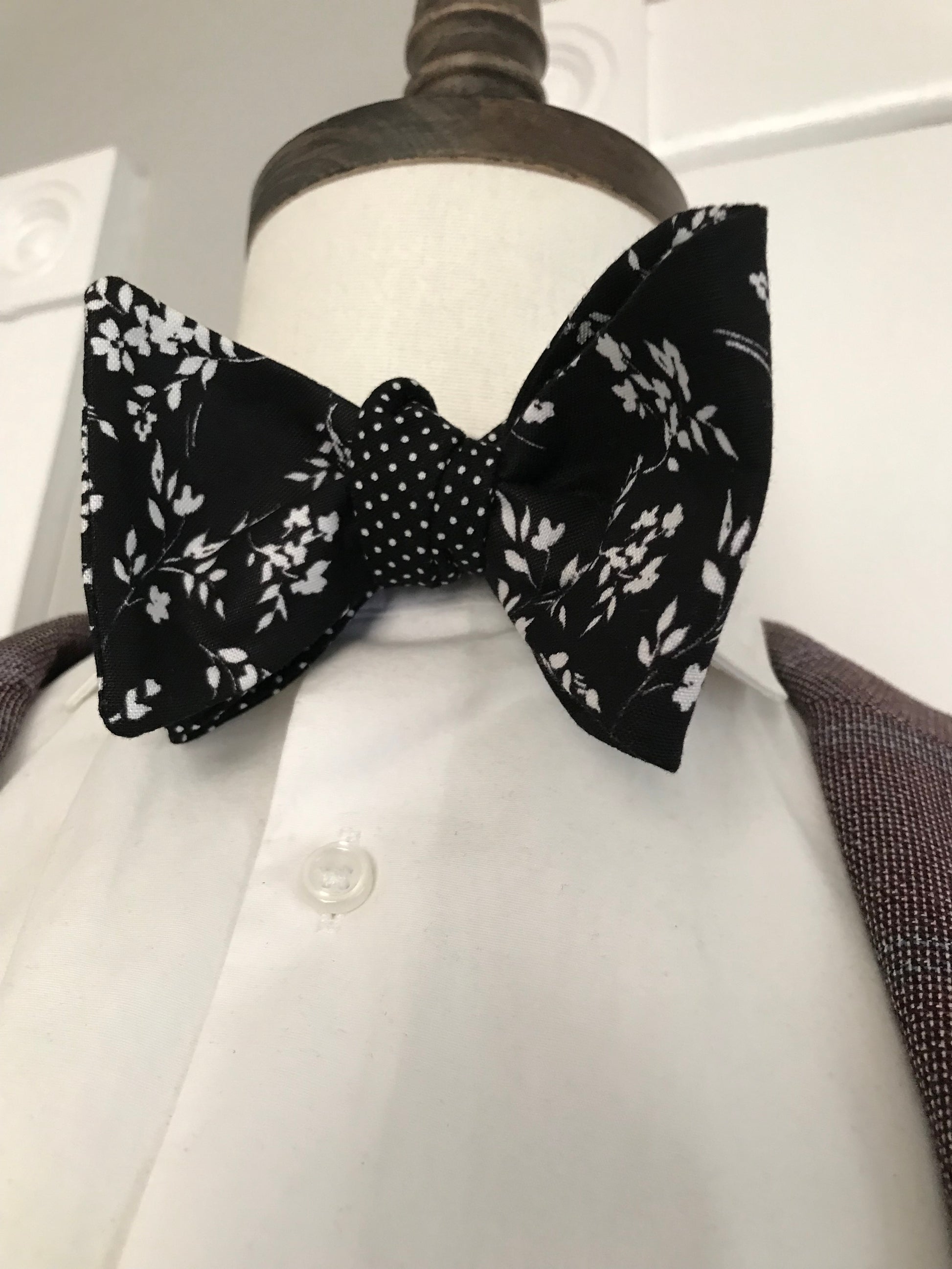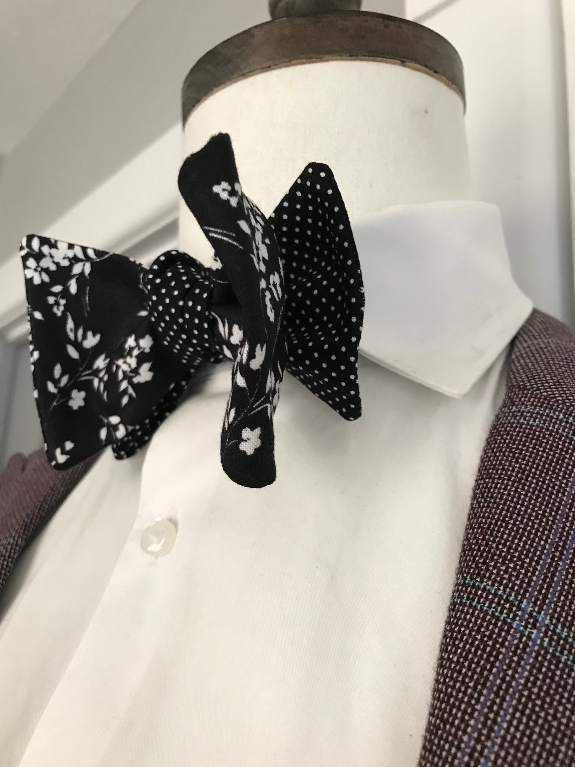 Black print and black and white paisley print reversible Bowtie set (traditional