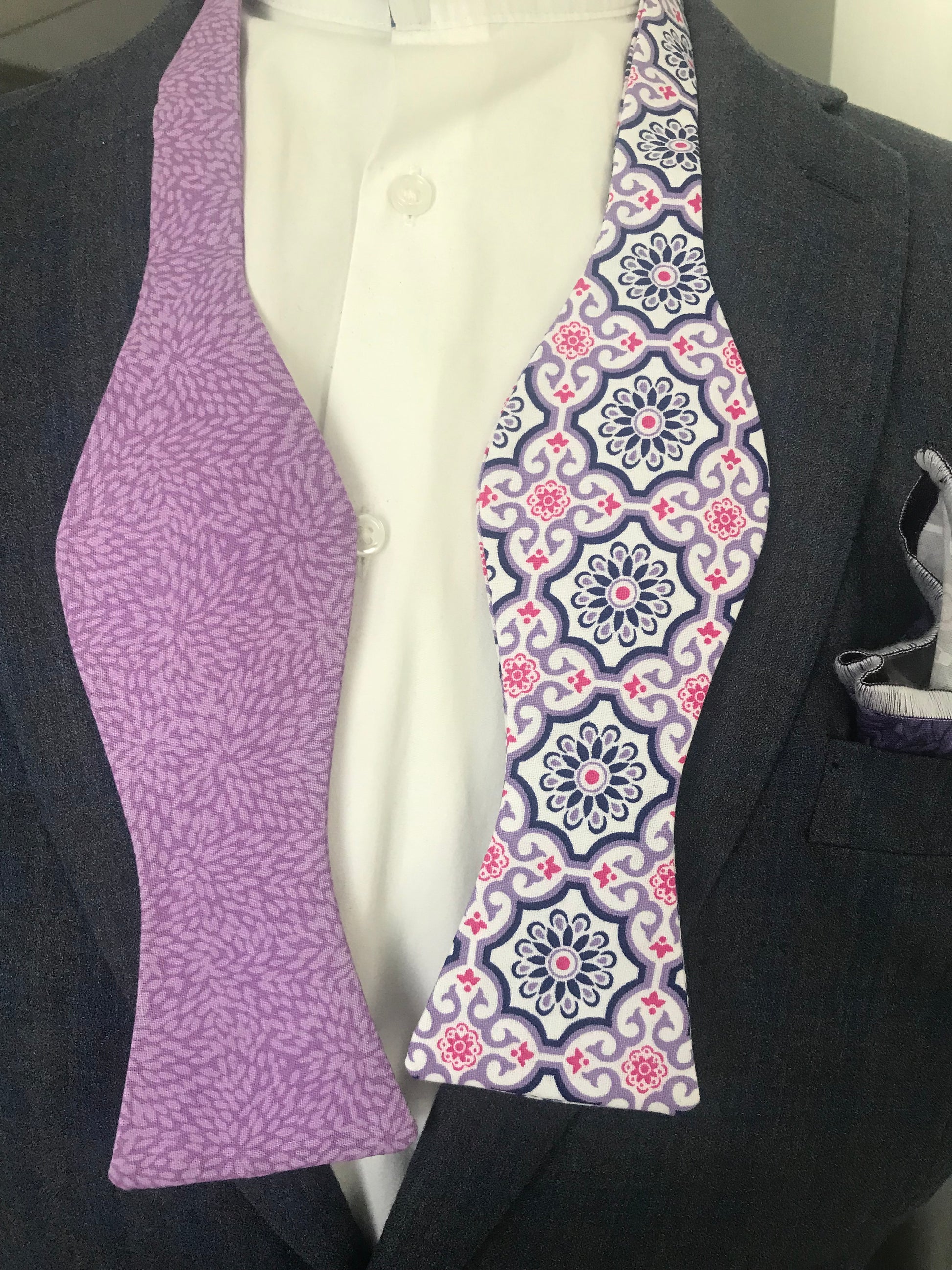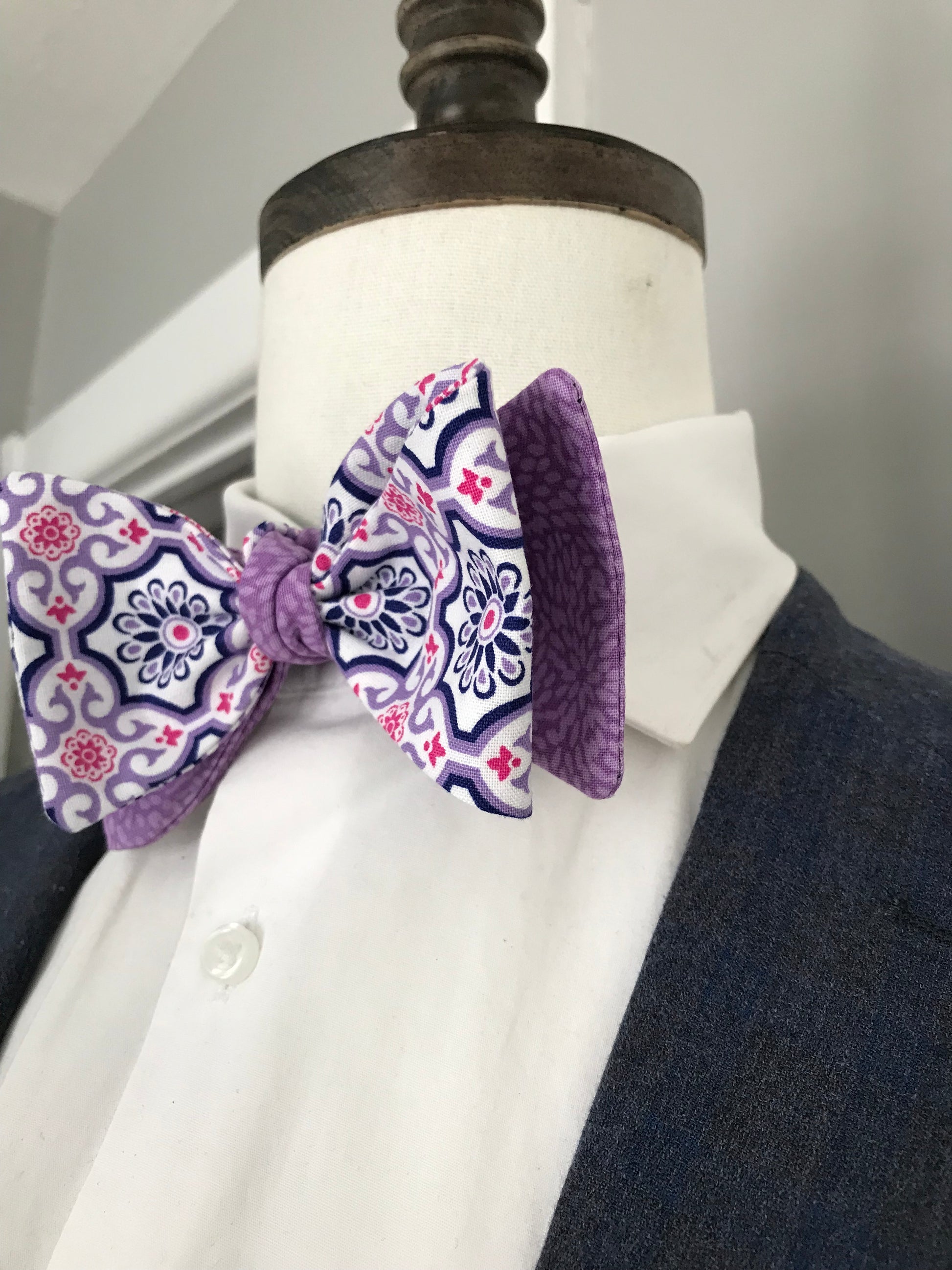 Upgrade your formal attire with our Lavender and Purple Print Reversible Bowtie Set. Handmade with high-quality cotton, this traditional style bowtie is the perfect addition to any outfit. Impress your fellow haberdashery lovers with this unique and versatile accessory.