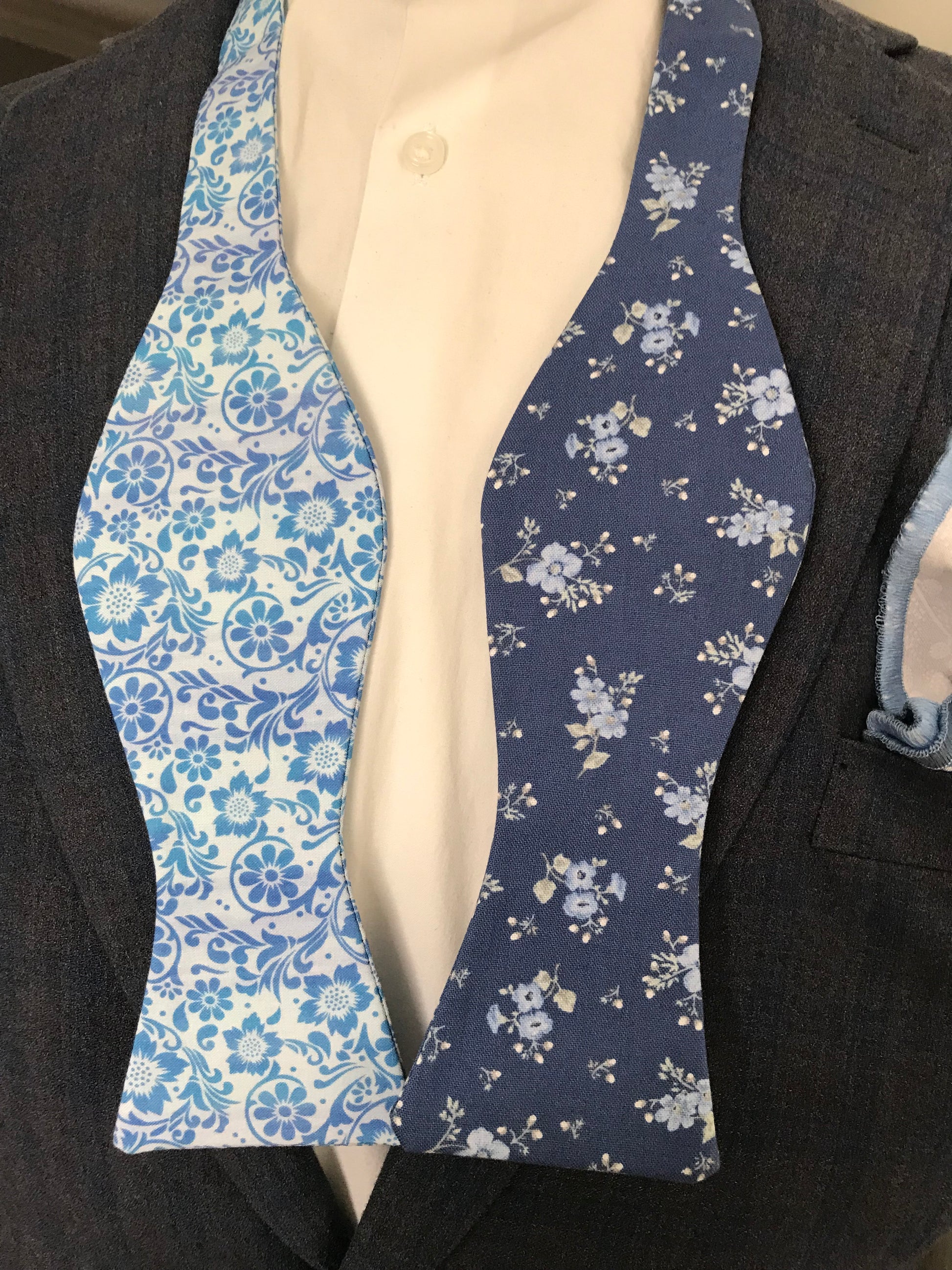 This reversible Bowtie set is handmade from high-quality cotton, making it perfect for any formal event. The light blue with blue print design adds a touch of elegance, while the reversible feature allows for versatility and customization. Perfect for any suit, this Bowtie set will elevate your look.